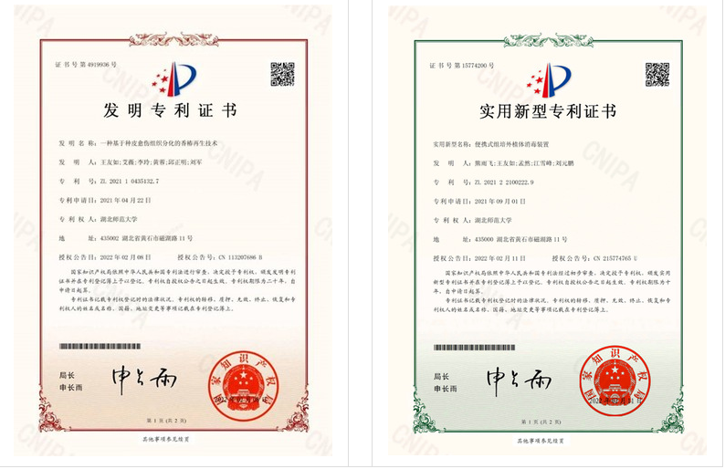 近日,重点实验室王友如教授科研团队在香椿无性快速繁殖和植物组培技术研究领域取得了阶段性成果。“一种基于种皮愈伤组织分化的香椿再生技术”喜获国家授权发明专利,该技术体系的建立为快繁名贵优良香椿品种,实现良种规模化生产,满足大棚或温室栽培需要,加快优质香椿品种的应用提供了强有力技术支撑。此外,“便携式组培外植体消毒装置”荣获实用新型专利,该装置能有效对植物组培外植体进行充分消毒,减少组培过程中的污染,提高经济效益,具有实用性和推广价值。