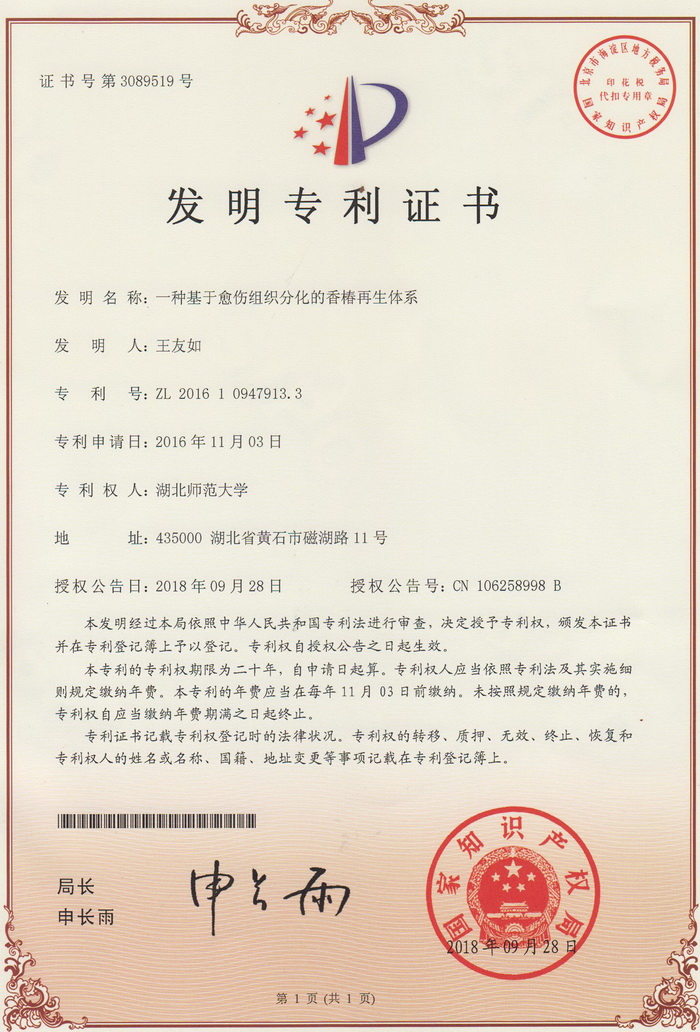 特色野菜良种繁育与综合利用技术湖北工程中心的王友如教授科研团队致力于优质野生菜用香椿种质资源的发掘与利用研究。近年来系统研究了外植体种类、培养基、激素种类和浓度、蔗糖浓度等影响香椿胚性愈伤组织诱导、分化、植株再生的因素,在香椿无性快速繁殖研究领域取得了阶段性成果,“一种基于愈伤组织分化的香椿再生体系”喜获国家授权发明专利。该专利为优质菜用香椿种苗工厂化生产研究提供了有力技术支撑。