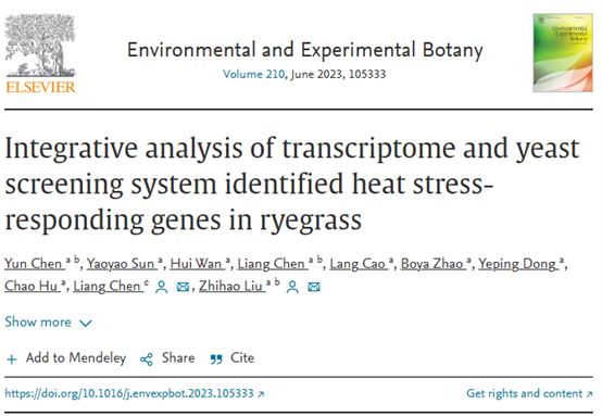 近日,特色野菜良种繁育与综合利用技术湖北工程中心与中国科学院武汉植物园联合在国际期刊《Environmental and Experimental Botany》(中科院生物学二区,植物科学一区,IF:6.028)在线发表题为“Integrative analysis of transcriptome and yeast screening system identified heat stress-responding genes in ryegrass”的研究论文。刘致浩博士与陈良研究员为通讯作者,陈云博士为第一作者,6686体育为第一单位。