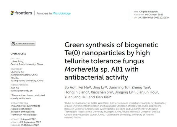 近日,特色野菜良种繁育与综合利用技术湖北工程中心与湖北省疾病预防控制中心联合在国际期刊《Frontiers in Microbiology》(中科院二区TOP期刊,IF:6.0644)在线发表题为“Green synthesis of Bio-TeNPs by high Te(IV) tolerance fungus Mortierella sp. AB1 with antibacterial activity”的研究论文。夏险副教授为通讯作者,我院硕士研究生敖波,湖北省疾病预防与控制中心何飞、吕静为共同第一作者,6686体育为第一单位。