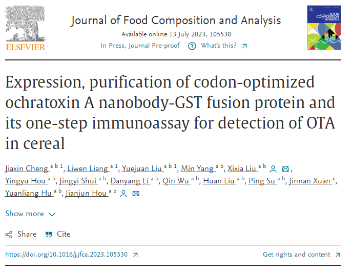 近日,特色野菜良种繁育与综合利用技术湖北工程中心的刘细霞副教授研究团队在Journal of Food Composition and Analysis(中科院2区,IF 4.3)发表题为“Expression, purification of codon-optimized ochratoxin A nanobody-GST fusion protein and its one-step immunoassay for detection of OTA in cereal”的研究论文。本科生程家欣、梁丽文、刘跃娟为共同第一作者,刘细霞副教授和侯建军教授为共同通讯作者。