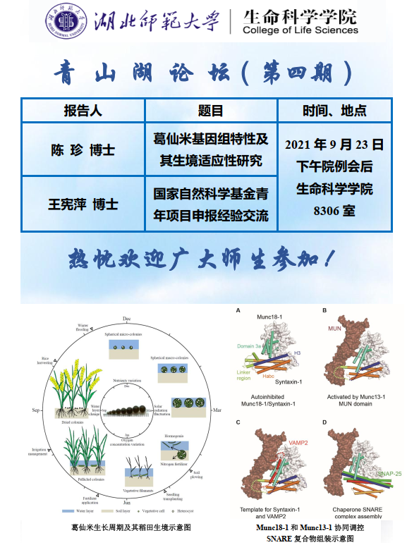2021年9月9日、9月23日下午,根据食用野生植物保育与利用湖北省重点实验室、特色野菜良种繁育与综合利用技术湖北省工程研究中心和黄石市生物药物产物研究院的工作安排,陈新鹏博士、刘娜博士、陈珍博士、王宪萍博士作了系列学术报告,学院部分领导、青年教师及研究生参加了报告会。报告会由副院长涂俊铭教授主持。